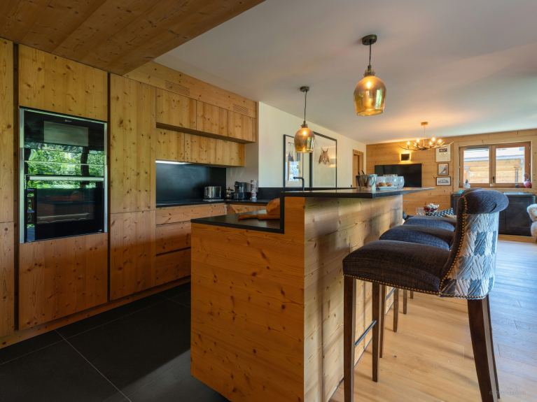 Das gemütliche Wohnzimmer verfügt über ein großes Sofa und Sessel mit Kunstpelzbezug, die um einen Kamin und einen Fernseher angeordnet sind. Die offene Küche ist sehr gut ausgestattet, unter anderem mit einer zentralen Theke und einem großen Esstisch. Dieser Raum führt auf einen überdachten und möblierten Balkon, der im Winter mit einem gasbetriebenen Feuerkorb beheizt werden kann.