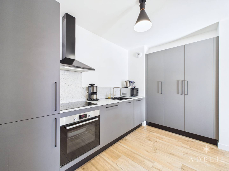 - Geräte: Backofen, Mikrowelle, Induktionskochfelder, großer Kühlschrank mit Gefrierfach, Nespresso-Kaffeemaschine, Wasserkocher, Toaster, Waschmaschine.