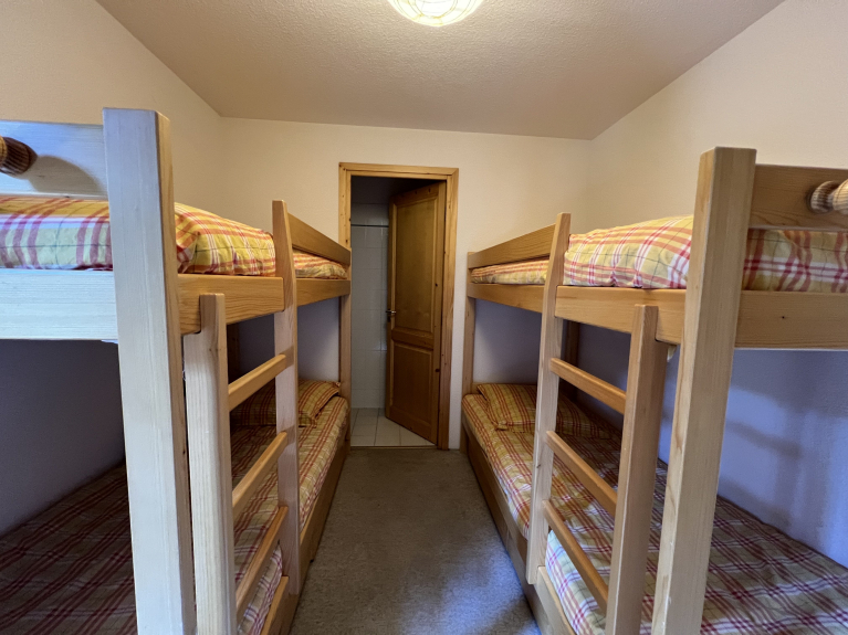 Ein Zimmer mit 4 Etagenbetten und sein Badezimmer.