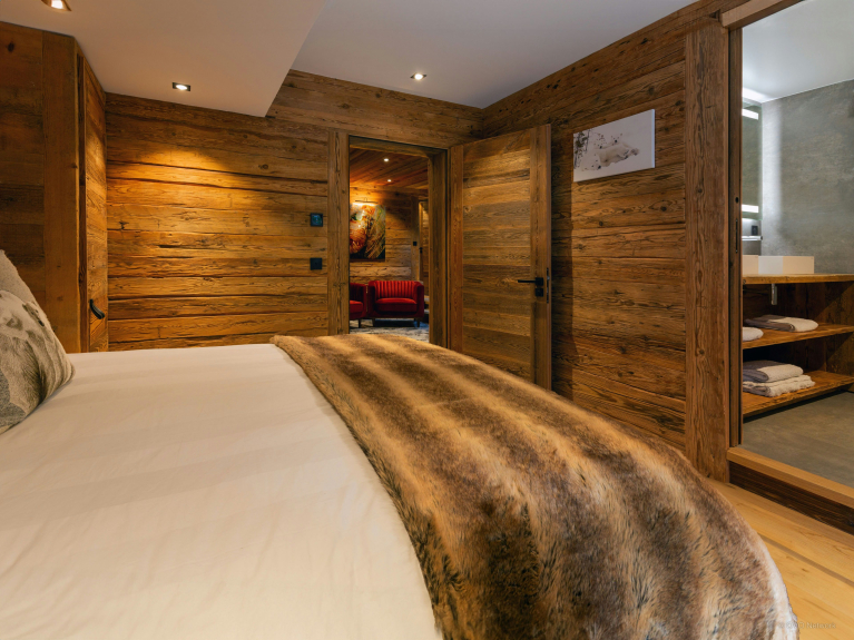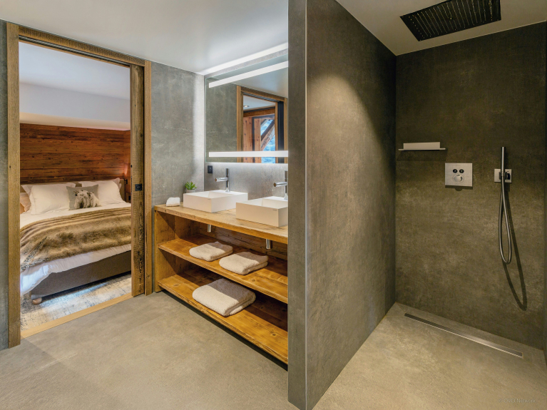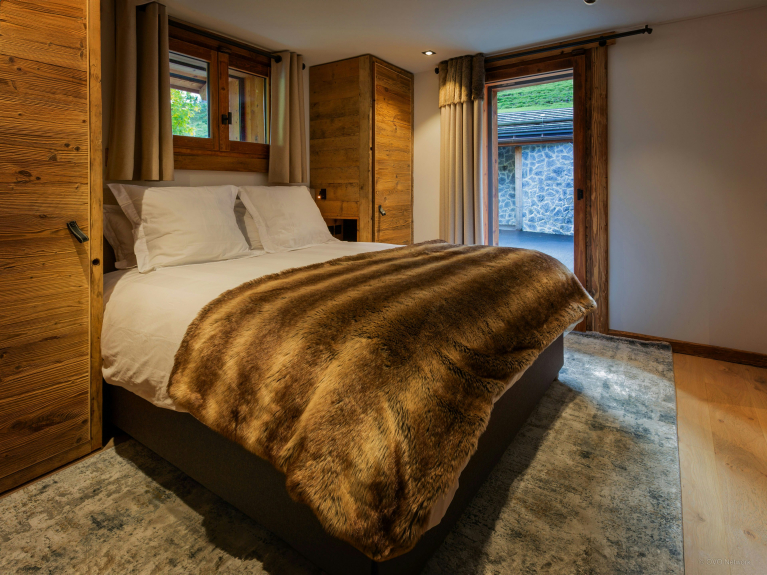 Fünf der sechs Schlafzimmer befinden sich im Erdgeschoss. Alle Zimmer sind mit einem großen Doppelbett ausgestattet und drei von ihnen verfügen über ein eigenes Badezimmer und Zugang zum Balkon. Die beiden anderen Schlafzimmer sind durch ein Badezimmer miteinander verbunden. Auf dieser Etage finden Sie auch einen Fernsehraum und einen Skiraum mit beheiztem Schuhtrockner, Waschmaschine und Trockner.