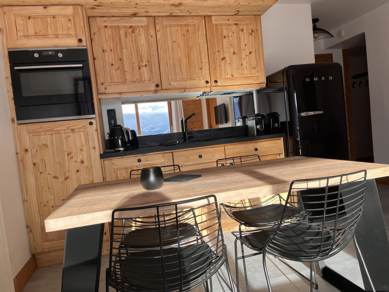 Ein großes, nach Süden ausgerichtetes Wohnzimmer/Küche mit atemberaubendem Blick auf den Beaufortain und den Mont Blanc