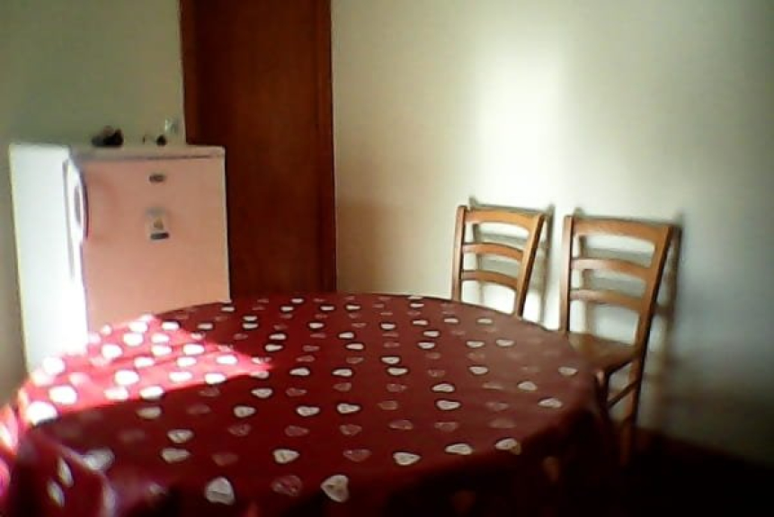 Die Küche ist mit einem Kühlschrank, einem runden Tisch, einem Gas- und Elektroherd mit Backofen, einer Spüle und einem Geschirrschrank ausgestattet.