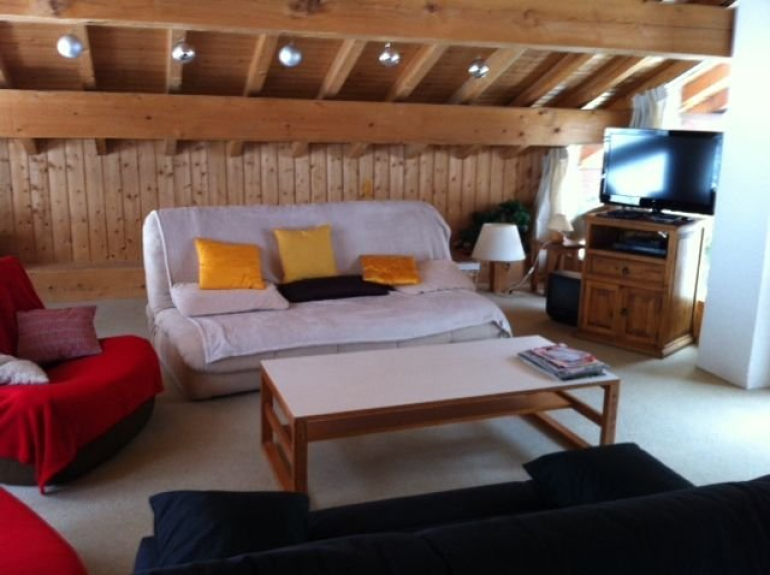 * Im Obergeschoss: ein großes, helles Zimmer mit Dachschrägen und großen Fenstern in Ost-West-Richtung, Blick auf die Pisten und Gipfel, ausgestattet mit einem Schlafsofa 140x190, einem Sofa, 2 Sesseln, Tisch, Schreibtisch, Kommode und Fernseher, Stauraum, Spielen und Comics.