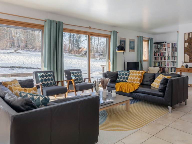 Im Erdgeschoss erhellen große Fensterfronten den Wohnbereich. Das Wohnzimmer ist mit seinem Holzofen gemütlich und die Leseecke ist mit Büchern und Musikinstrumenten gefüllt, die Ihre Abende verschönern werden. Der von natürlichem Licht durchflutete Esstisch ist groß genug, um Ihrer gesamten Gruppe Platz zu bieten. Die offene Küche ist extrem gut ausgestattet und verfügt über großzügige Vorbereitungsmöglichkeiten.