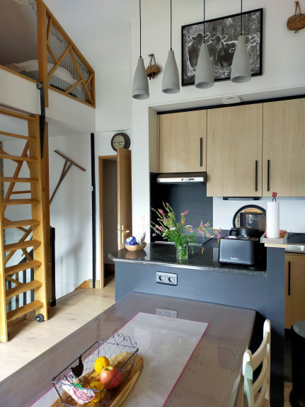 Küche mit Induktionskochplatten, Mikrowellenherd mit Grill, niedriger Kühlschrank, Geschirrspüler, Dunstabzugshaube, traditionelle und italienische Kaffeemaschine, Wasserkocher, Toaster, Fondue-Gerät, Raclette-Gerät, Croque-Monsieur-Gerät, Crepes-Party-Gerät, Mixer, viel Stauraum, Tisch für 8 Personen, Geschirr für 8 Personen.