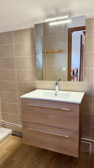 Es besteht aus einem Eingangsbereich, einem Ess- und Wohnzimmer, 2 Schlafzimmern, 2 Badezimmern und 2 WCs, einer voll ausgestatteten Küche mit Elektrogeräten, einem Garten und einem Parkplatz,