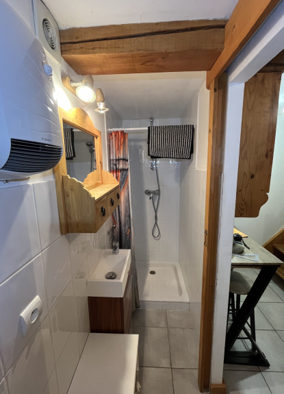 Im Erdgeschoss: eine ausgestattete Küche und ein Badezimmer mit WC.