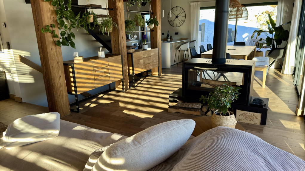Wohnraum mit 3 großen Fensterfronten und einem großen festen Fenster, mit Blick auf Balkon und Terrasse mit Blick auf die Pisten und das Dorf, Bibliotheksecke/TV, SONOS-Lautsprecher im Wohnraum, Wohnzimmerecke mit einem schönen zentralen Kamin mit Blick auf das Wohnzimmer und das Esszimmer, Esszimmerecke mit einem großen Tisch, an dem bis zu 10 Personen Platz finden, Küche mit Zugang zur großen Terrasse, Zugang über eine Fenstertür, Einbauküche mit Kochinsel (Ceranfeld mit integrierter Dunstabzugshaube, Backofen, Mikrowelle, Kühlschränke, Gefrierschrank, Geschirrspüler, komplettes Kochgeschirr, Kaffeemaschine, Toaster, Wasserkocher, Nespresso-Kaffeemaschine (einige Kapseln werden bereitgestellt), Fondue- und Raclettegerät.