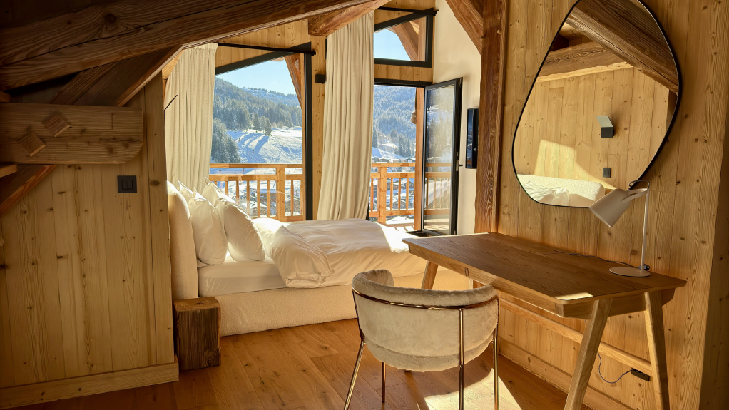 - Schlafzimmer Nr. 4 mit Doppelbett en suite (WC, Dusche, Badewanne mit Pistenblick, Doppelwaschbecken, Fenster) mit einem großen Fenster zum Balkon und einem großen Fenster, einem Doppelbett (160x200), Fernseher, Parkettboden, begehbarem Kleiderschrank, Sonos-Lautsprecher.