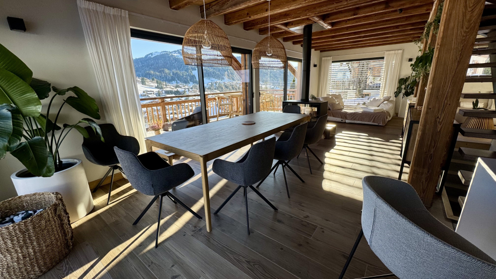 Wohnraum mit 3 großen Fensterfronten und einem großen festen Fenster, mit Blick auf Balkon und Terrasse mit Blick auf die Pisten und das Dorf, Bibliotheksecke/TV, SONOS-Lautsprecher im Wohnraum, Wohnzimmerecke mit einem schönen zentralen Kamin mit Blick auf das Wohnzimmer und das Esszimmer, Esszimmerecke mit einem großen Tisch, an dem bis zu 10 Personen Platz finden, Küche mit Zugang zur großen Terrasse, Zugang über eine Fenstertür, Einbauküche mit Kochinsel (Ceranfeld mit integrierter Dunstabzugshaube, Backofen, Mikrowelle, Kühlschränke, Gefrierschrank, Geschirrspüler, komplettes Kochgeschirr, Kaffeemaschine, Toaster, Wasserkocher, Nespresso-Kaffeemaschine (einige Kapseln werden bereitgestellt), Fondue- und Raclettegerät.