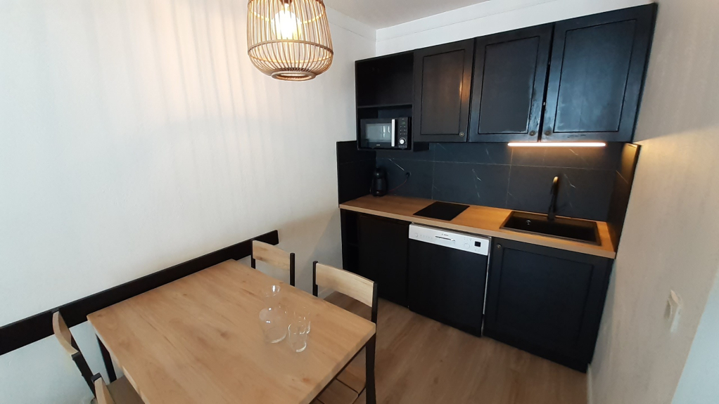 - Kochnische mit 2 Induktionskochplatten, Kühlschrank, Geschirrspüler, Kombi-Mikrowelle und Backofen.