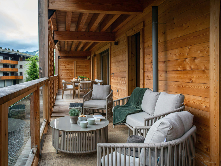 Das Wohnzimmer, das mit zwei Sofas und einem Sessel ausgestattet ist, verfügt über eine große Fensterfront, die Zugang zu einer überdachten Südterrasse bietet. Diese Terrasse, die mit einem zweiten Esstisch und einer Sitzecke im Freien ausgestattet ist, bietet ein grünes Panorama, das zum Entspannen einlädt.