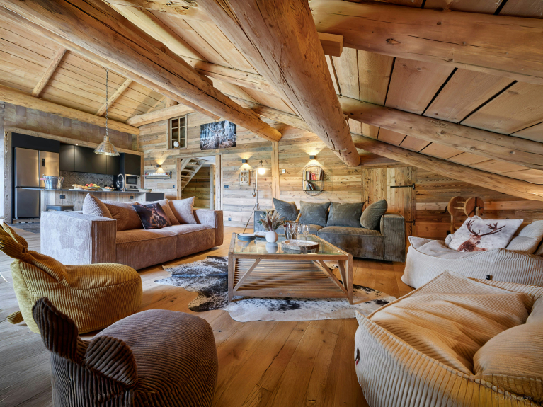 La Ferme de la Caillère wurde für die komfortable Unterbringung von bis zu 10 Personen konzipiert und verbindet Authentizität mit modernem Komfort in der Umgebung eines alten, renovierten Bauernhauses. Diese Wohnung, die die Atmosphäre eines echten Chalets besitzt, das auf einer Etage und einem Zwischengeschoss eingerichtet ist, verfügt über vier Schlafzimmer und vier Badezimmer, von denen drei nebeneinander liegen.