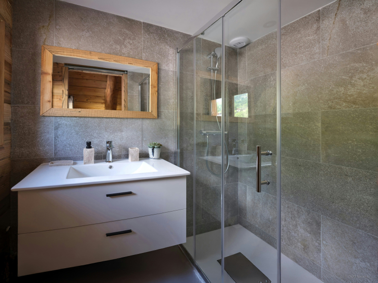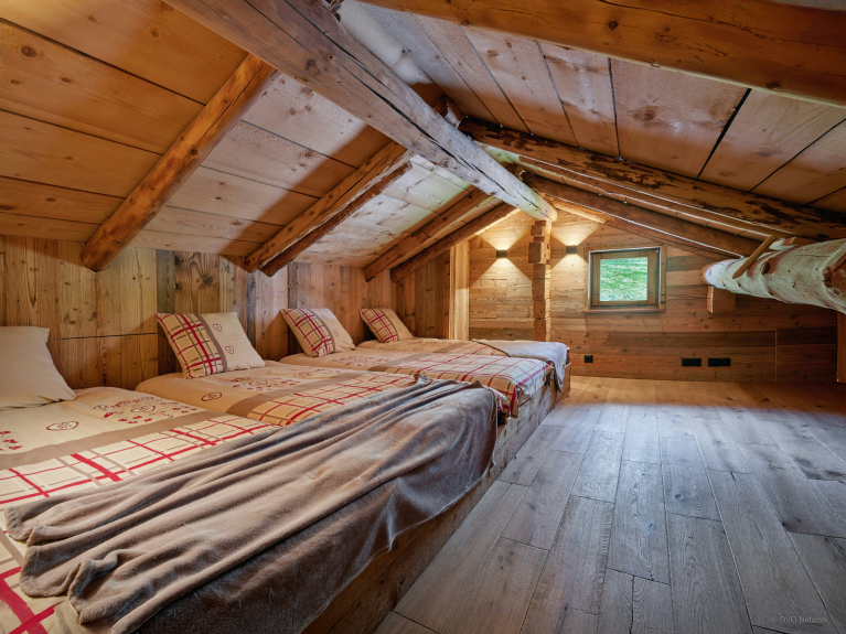 Die drei Doppelzimmer der Wohnung verfügen jeweils über ein eigenes Duschbad und ein separates WC. Das Zwischengeschoss, ideal für Kinder oder Freunde, verfügt über vier Einzelbetten, mit einem zusätzlichen Duschbad und einer Toilette am Ende der Treppe.