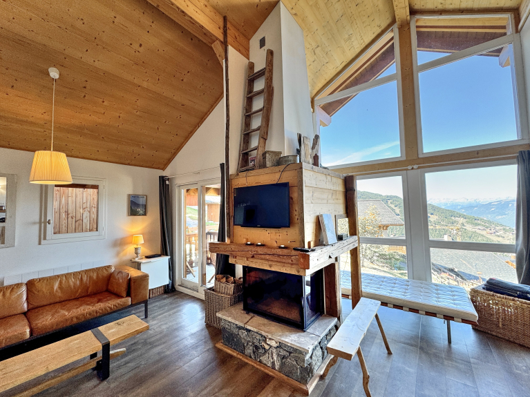 Das Wohnzimmer verfügt über einen Kamin, der es in kalten Nächten noch gemütlicher macht, ein Sofa und zwei Sessel und bietet einen atemberaubenden Blick auf das Tal.