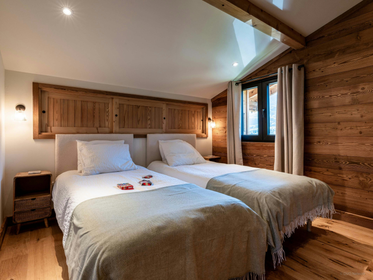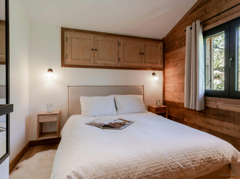 Die vier Schlafzimmer und zwei Badezimmer mit Toilette des Chalet Mushy verteilen sich auf das Obergeschoss und das Gartengeschoss. Letzteres verfügt übrigens über einen praktischen separaten Eingang.