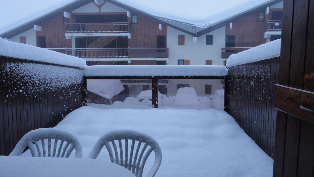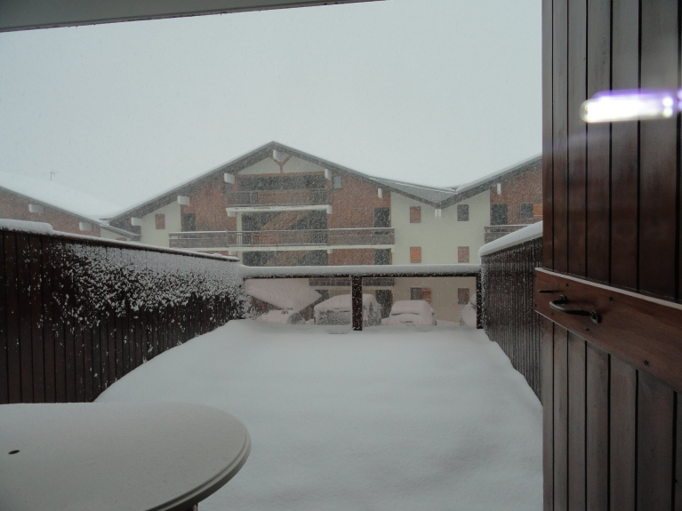 Schöne und angenehme Terrasse von 18 m2, Südlage, Blick auf Bisanne und Légette. Liegestühle, Sonnenschirm, Tisch und Stühle stehen zur Verfügung.