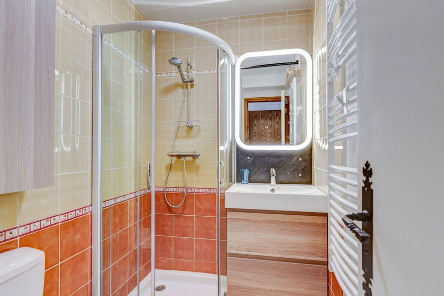 - Ein Badezimmer mit einer Dusche, einem Waschbecken, einer Toilette und einem beheizten Handtuchtrockner mit Gebläse.