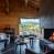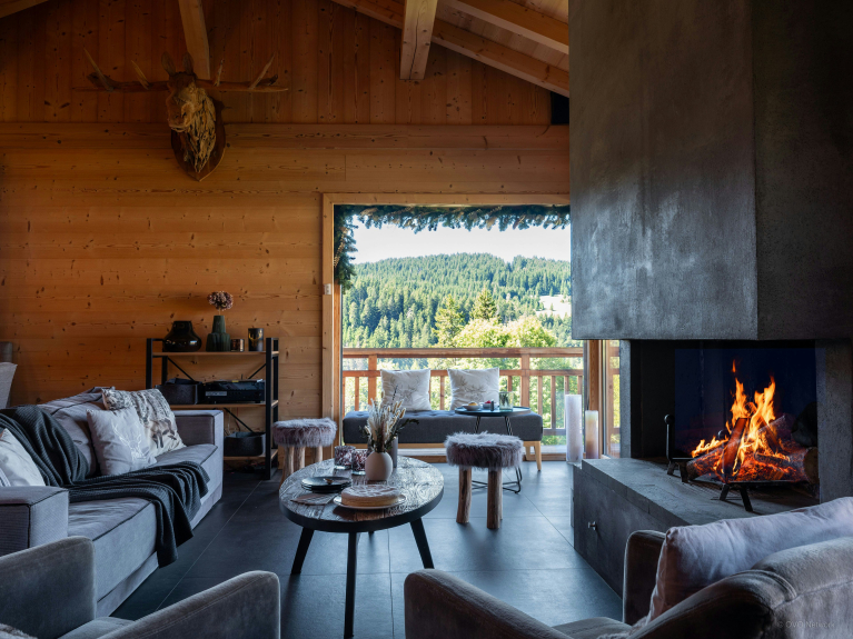 Der offene Wohnbereich, der ein Wohnzimmer mit Kamin, eine voll ausgestattete Küche und einen Esstisch vereint, befindet sich im Erdgeschoss. Große Fensterfronten sorgen für viel natürliches Licht und führen auf eine Terrasse mit einem zweiten Tisch und einem Sofa.