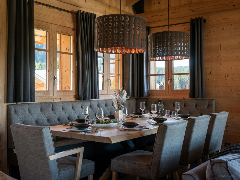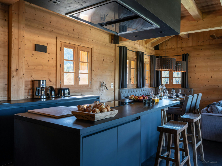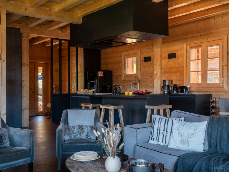 Das Chalet K wurde für bis zu zehn Personen auf drei Etagen konzipiert und verfügt über vier Schlafzimmer und ebenso viele Badezimmer.