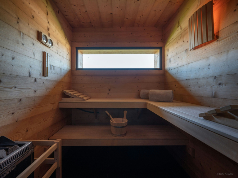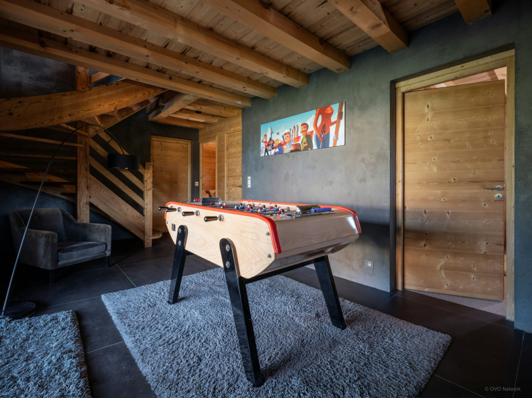 Die untere Etage ist dem Wohlbefinden und dem Austausch gewidmet. Hier finden Sie eine Sauna, begleitet von einer Dusche, und einen überdachten Whirlpool auf der Terrasse, für entspannende Momente inmitten der Berge. Ein Tischfußball belebt die Familienabende.