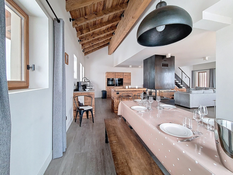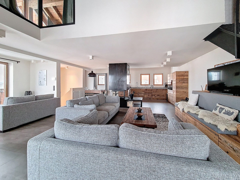 Offener Bereich mit Zugang zu einem Wohnzimmer und einer ausgestatteten Küche. Der Zugang zu zwei Balkonen ermöglicht es Ihnen, den freien Blick auf die Berge zu genießen.