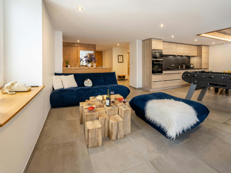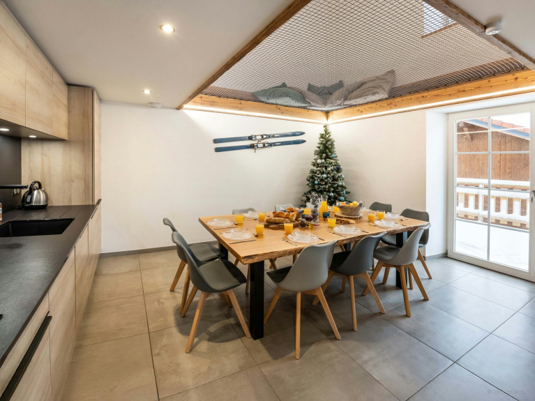 Der Wohnraum ist natürlich das Herz des Chalets. Hier können Sie die Wärme des Kaminfeuers genießen und sich zu einer Partie Tischfußball oder Darts treffen. Direkt darüber befindet sich ein Spielzimmer, dessen Netzboden es den Kindern ermöglicht, sich zu vergnügen und gleichzeitig in Hörweite zu bleiben. Dieser spielerische Ansatz verleiht dem Refuge de Lucien einen besonderen Charakter.