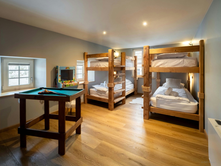 Das Chalet verfügt über vier Schlafzimmer, von denen drei Zugang zu einem eigenen Badezimmer haben. Kinder und Jugendliche werden den Schlafsaal mit seinen Etagenbetten, der Spielhalle und dem Mini-Billardtisch lieben: ein Raum nur für sie, in dem sie gemeinsam Spaß haben können.