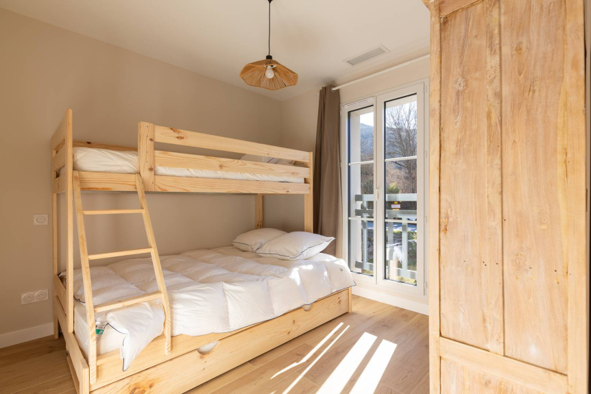1 Schlafzimmer mit Etagenbett (Bett 140+2 Betten 90).