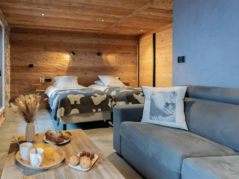 Die beiden Schlafzimmer bieten jeweils ihr eigenes Universum und ein angrenzendes Badezimmer, ein wahrer Luxus für ein Chalet dieses Formats. Die Suite im obersten Stockwerk mit ihrer Whirlpool-Badewanne ist wie eine Entspannungspause nach einem aktiven Tag gedacht. Weiter unten öffnet sich das zweite Schlafzimmer auf einen Balkon, damit Sie schon am Morgen die frische Luft genießen können. Auf Anfrage kann es mit einem Doppelbett oder zwei Einzelbetten hergerichtet werden.