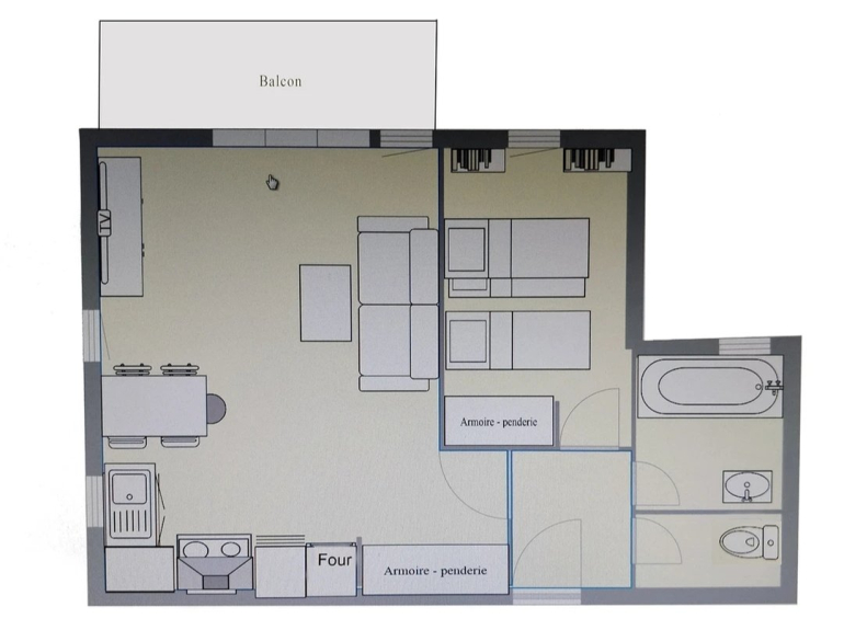 MIETEN in MERIBEL MOTTARET 1850M. Zwei Zimmer 35 m2 .Küche, Badezimmer (Badewanne) unabhängiges WC. Waschmaschine und Trockner in der Residenz.