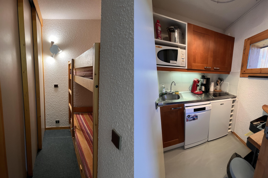 Résidence Améthyste "Skis aux pieds" Appartement GENTIANE: Sie befinden sich in einem Appartement mit einer Fläche von 22m², im 2. Stock mit Aufzug, ausgestattet für 4 Personen, mit allem Komfort, ausgestatteter & separater Küche, teilbarem Wohnzimmer: Kammbett und Bergecke (kann geschlossen werden) mit 2 Etagenbetten. Beheizter und mit einem Digicode gesicherter Skischrank. Direkter Zugang zu den Pisten.