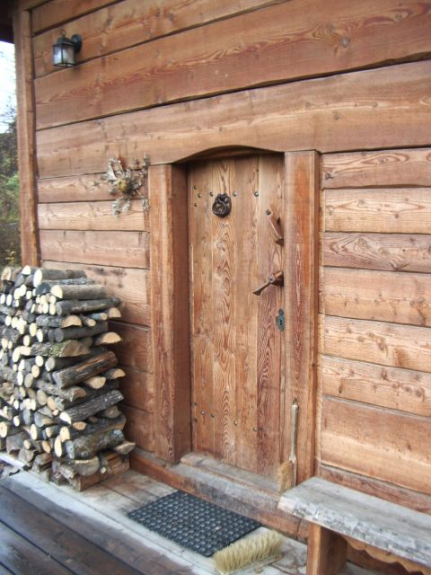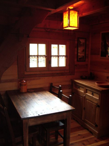 Warme und intime Atmosphäre in diesem sehr kleinen Holzchalet, das nach dem Vorbild der Schweizer Mazots gebaut wurde; Wohnfläche: 22 m2
