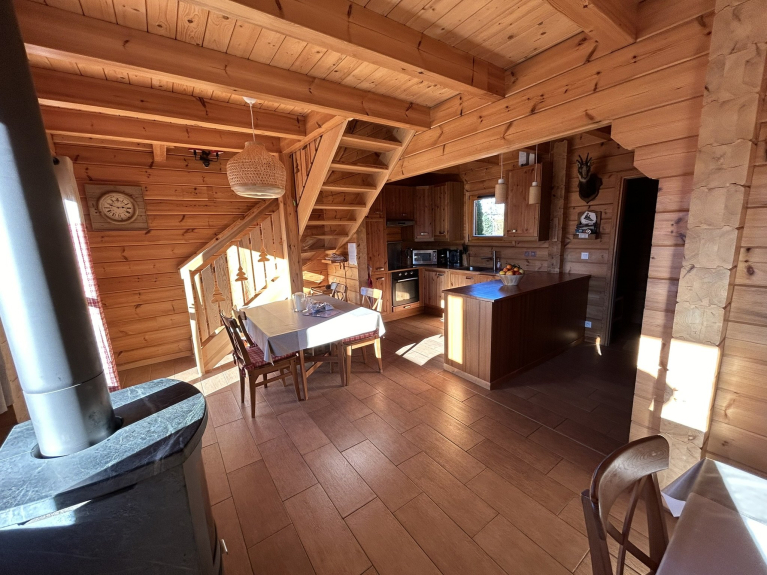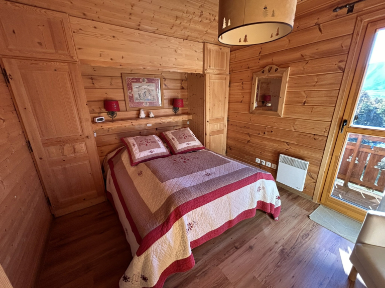 Welcome to 'l'Ecureuil', a charming chalet with all the comforts of home, in solid pine of 120 m2, very quiet, panoramic view, 200 meters from the slopes and 150 meters from the shops, can accommodate up to 8/9 people. Large living room of 54m2. Large terrace of 45m2 with table. Private land and parking (in front of the chalet). Fenced garden. 4 bedrooms (2 beds in width 160, 1 in 140, 2 in 80), 2 bathrooms, 2 WC. Washing machine. Satellite TV. Free WIFI (Freebox debit 9 Mégas). 5min walk to the new aquatic wellness center!