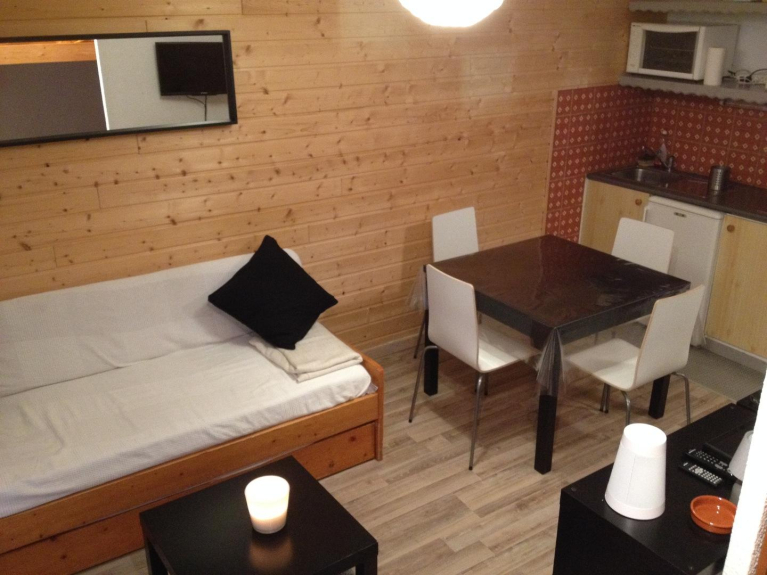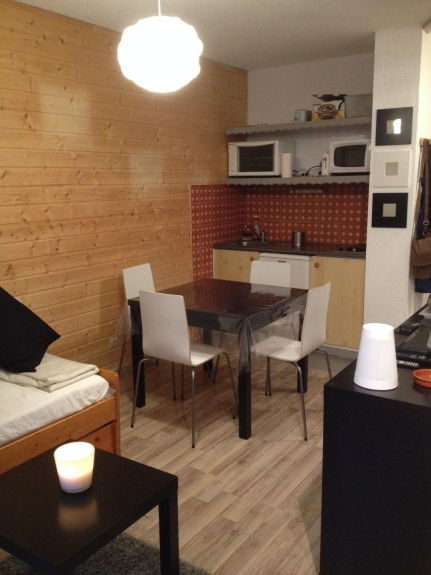 Renovated flat. 2 rooms : livingroom with kitchen and a bedroom. On ground floor : you can park your car in front of the flat, and on the 3rd floor compared to the center of the village. Bedroom with 2 double beds (superposed), an extra bed in the living room and a bed for babies.