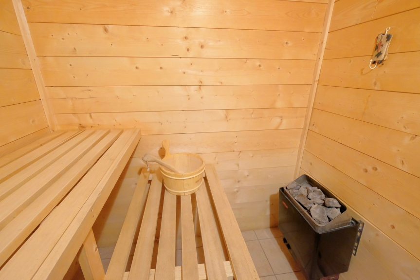 The jacuzzi is outside in Scandinavian style, as is the ski room, and the sauna is on the ground floor.