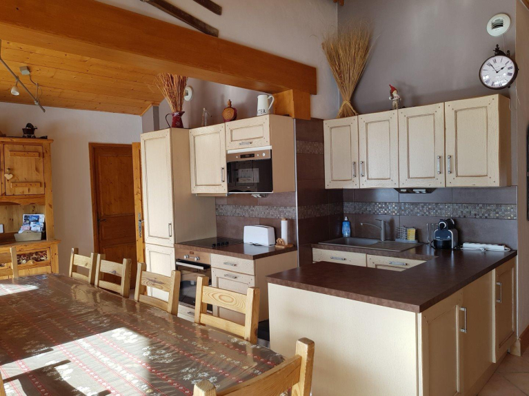 Apartment on the 1st floor of a small chalet with 3 apartments. Large balcony facing south, open view on Bisanne and Pierra Menta. At the edge of the slopes, next to the ski school and the sports centre. Carefully decorated mountain style. 5 bedrooms, 2 bathrooms and 2 separate toilets. Ideal for 11 people, 2 ski lockers, 2 covered parking spaces and 1 private air parking space.
