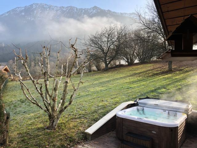 Large mountainhouse, all comfort, 4 bedrooms, quiet,large backyard, great view, south terrace, close to Annecy lake, Giez and Talloires golf courses. Close to many ski resorts: Aravis, Val d'Arly, Contamines, Areches,... Heated spa on the terrace.