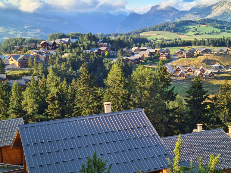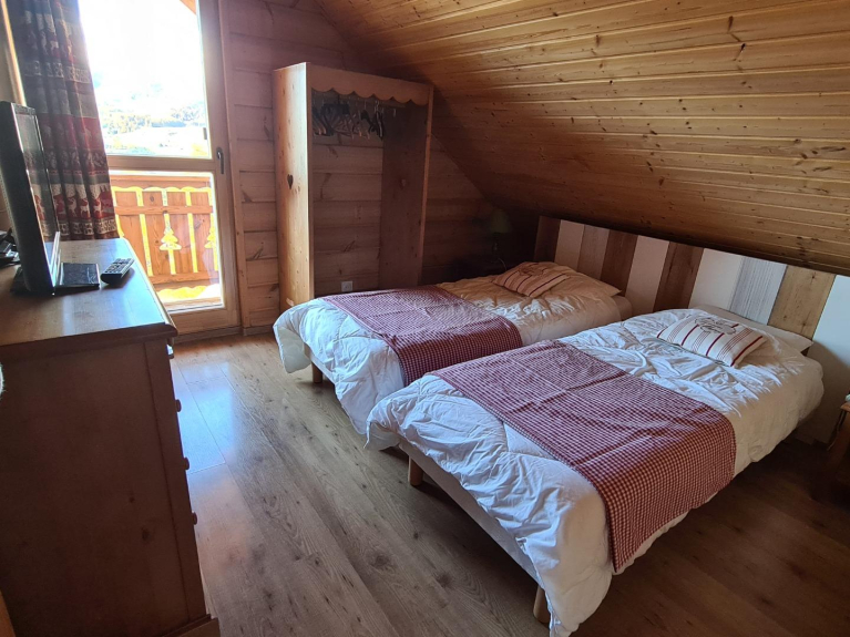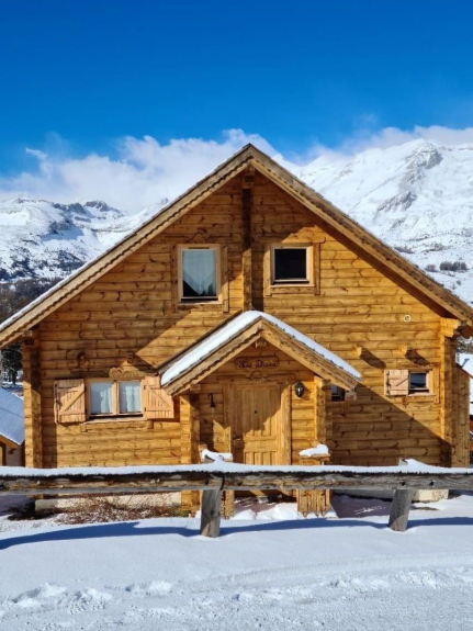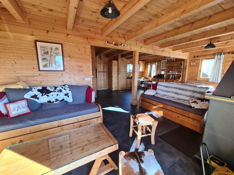 Cosy massive wood individual chalet, ideally located with panoramic mountain views, very quiet, fully equiped, tastefully decorated, large 20 m² terrace, spacious open-plan living / dining/ kitchen area of 50 m² with fireplace, close to ski slopes and shops (150 m).