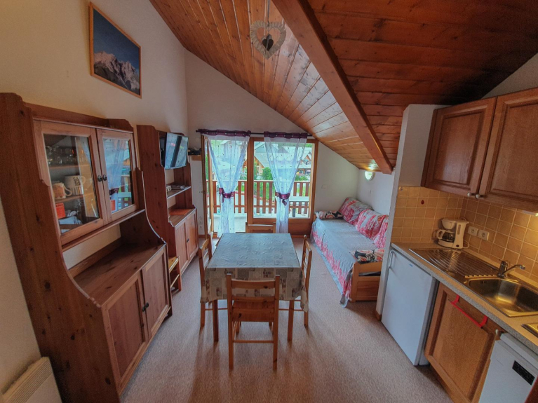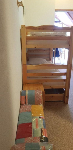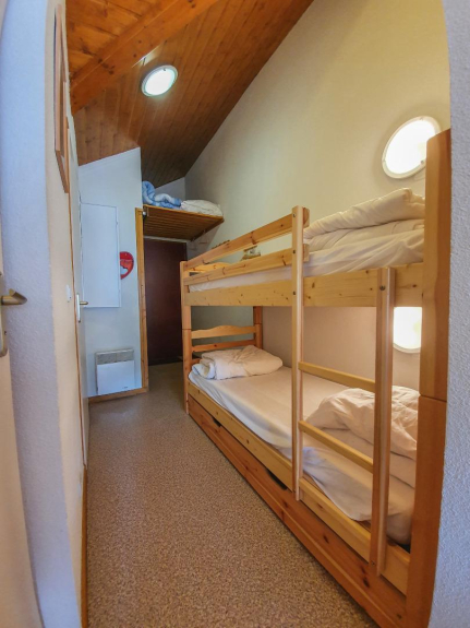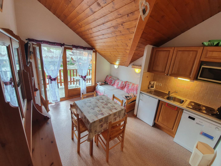 T2 sleeping 4 to 6, south facing, on the top floor facing the slopes, composed of a beautiful living room with kitchenette, a single bedroom with 2 bunk beds, bathroom with separate toilet.