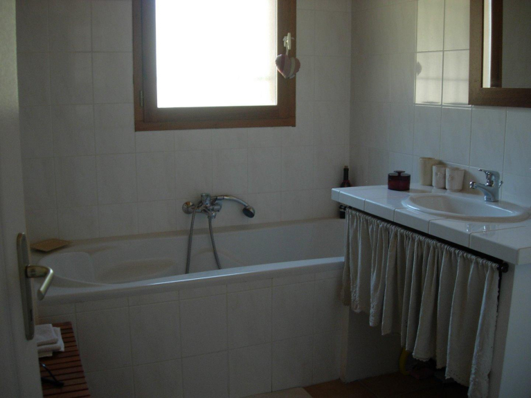 Entrance with cloakroom, WC + washing machine, parental bedroom with bathroom, living room / lounge with large fireplace (wood provided), independent kitchen (refrigerator with freezer, dishwasher, coffee maker, espresso machine, kettle, oven, 4 electric hotplates, fondue and raclette appliances, waffle iron, thermomix Vorwerk, toaster, microwave) garage and terrace with tables, garden chairs, deckchairs and parassol.