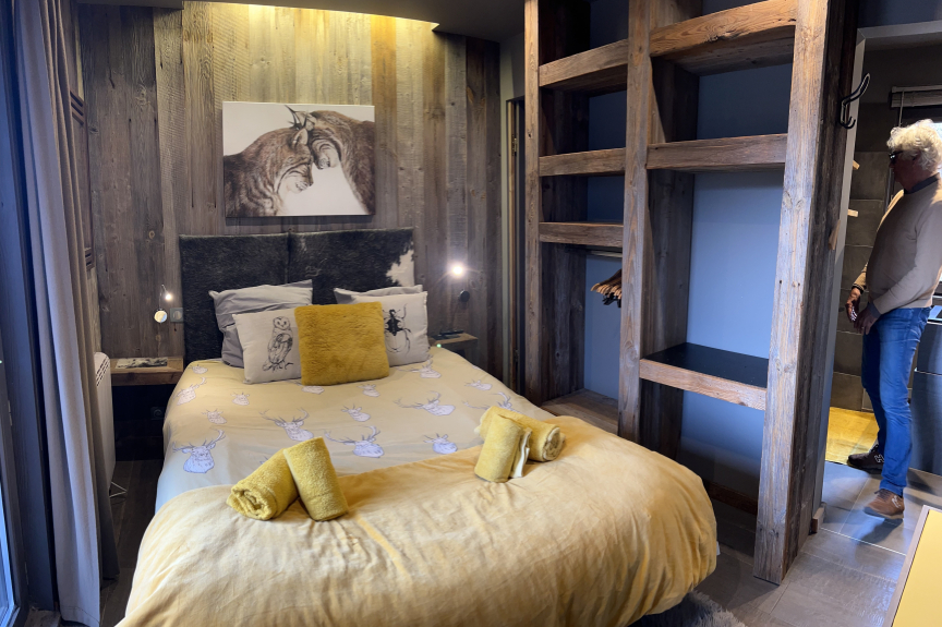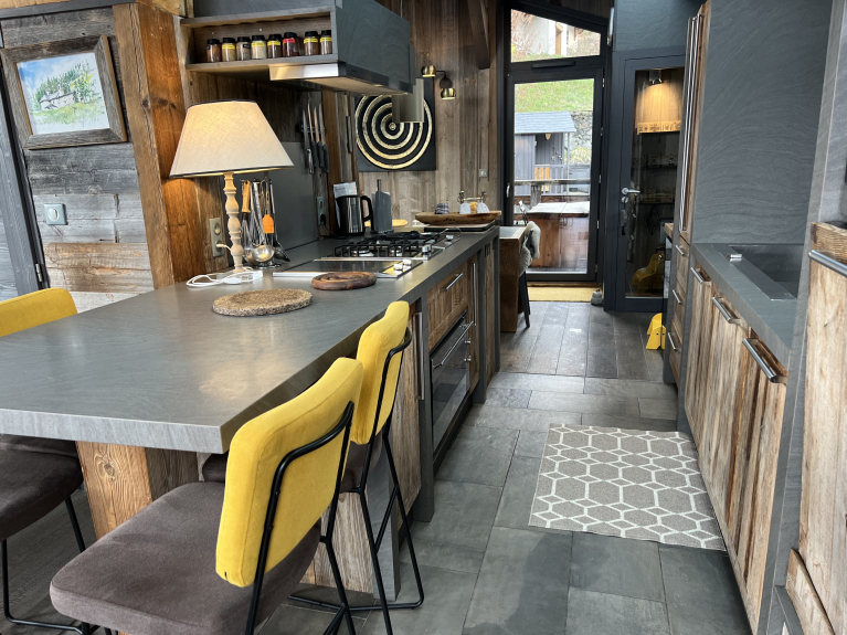 This chalet combines the comfort of modernism with the warmth of a wooden construction. My decorating wife used old materials in a contemporary space. The setting is warm, very comfortable and the smallest detail has been thought out to ensure optimal comfort in a luxurious environment.