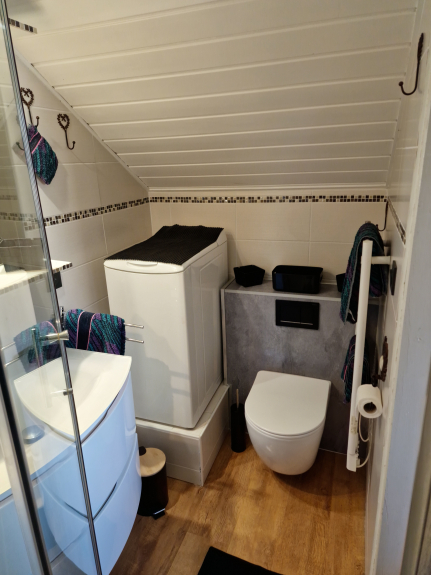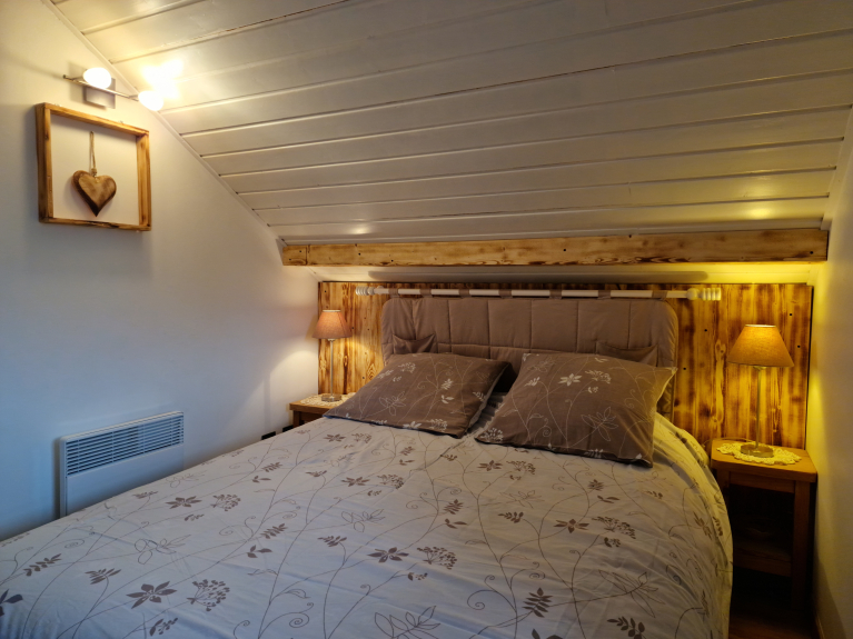 - 1 bedroom with 1 double bed, width 1.60 m, and an adjoining toilet with shower, sink and WC.