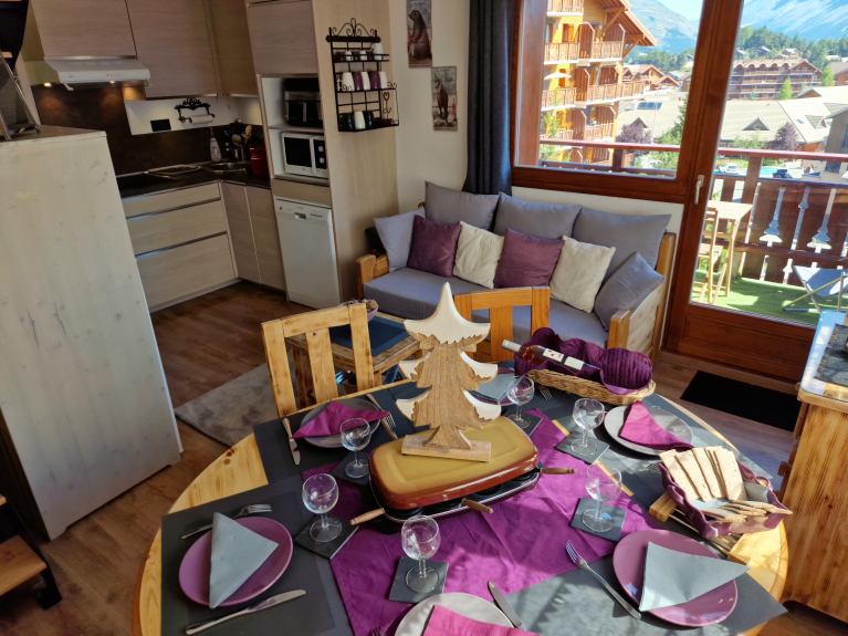 It is located on the 3rd floor in a very nice recent building in the heart of the resort at 100 m from the slopes and very close to all the shops.
