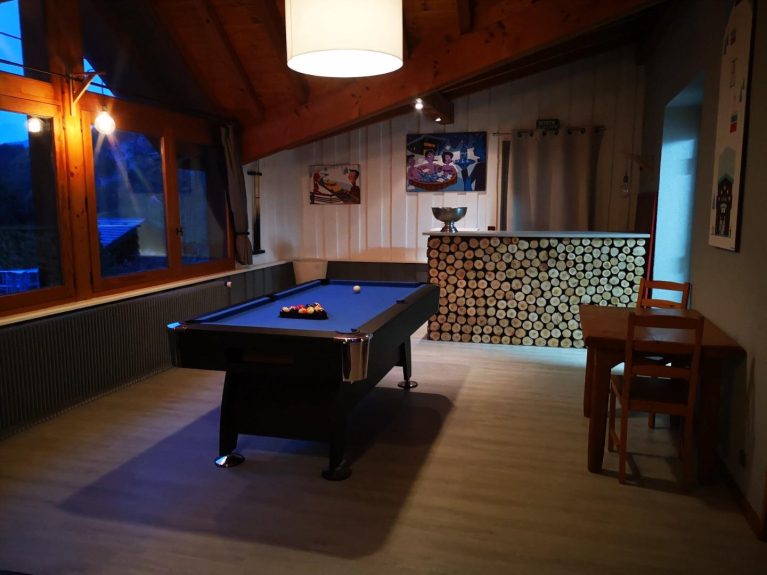 On the ground floor, you will take advantage of space on more than 150 m2: very spacious lounge according to your desires you can play billiard or tablefootball, watch TV or listen music (DVD satellite-reader), or simply read a book (books and games). Of course,if you need to be connected there is a free WiFi available.