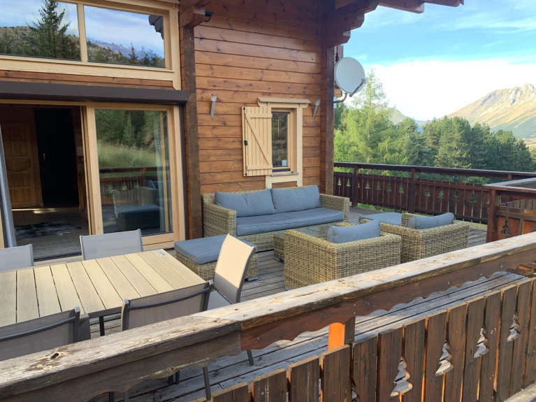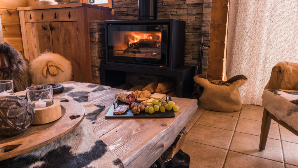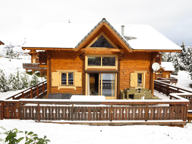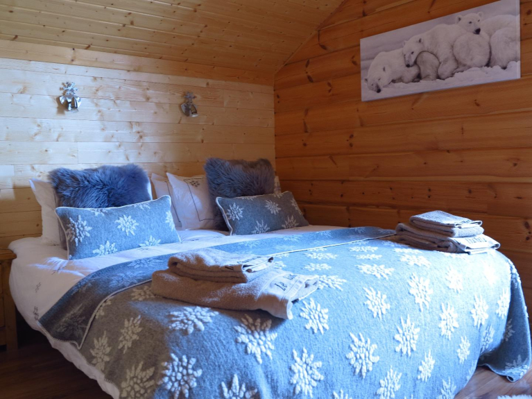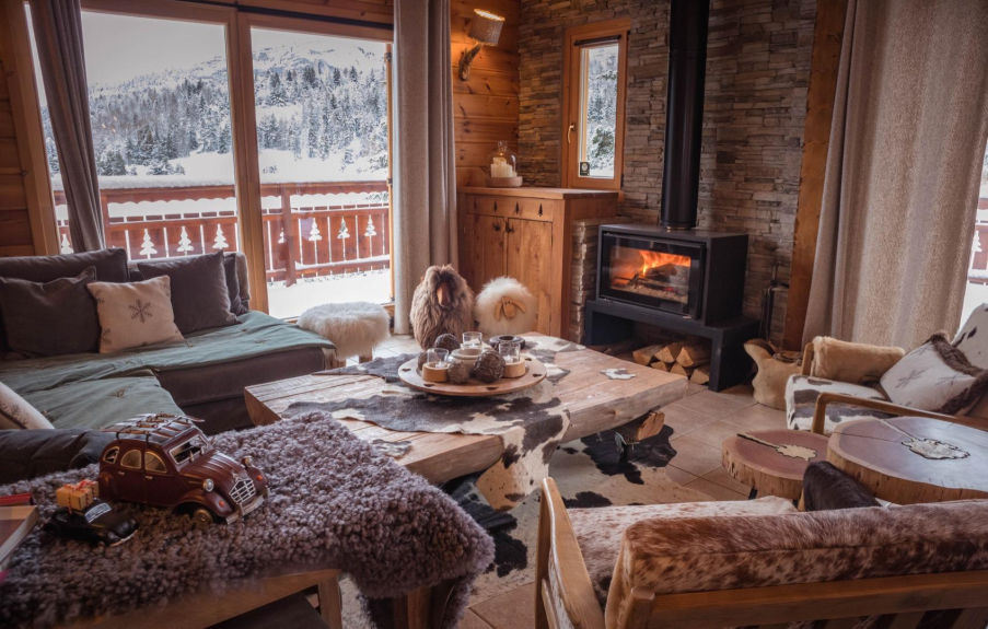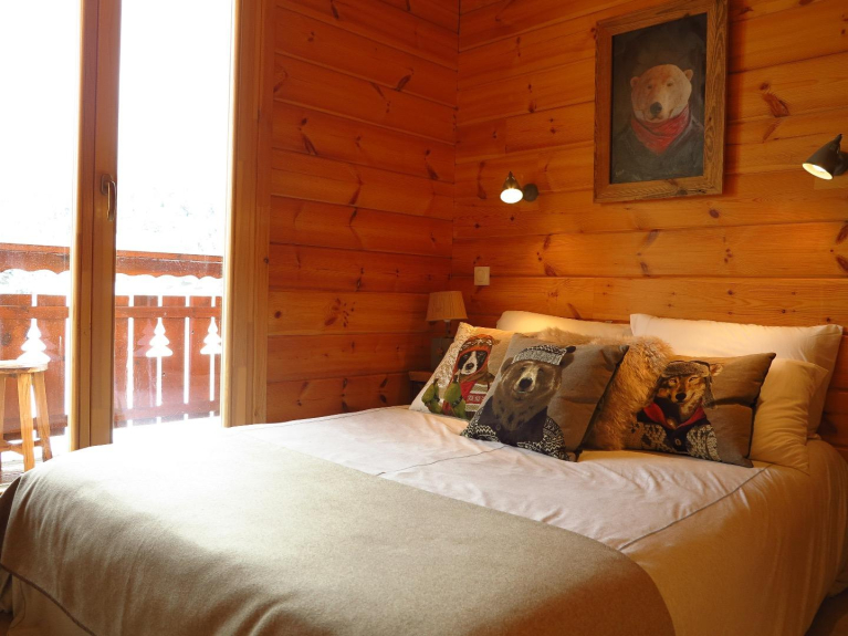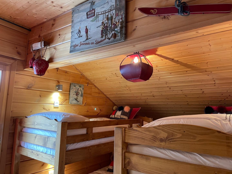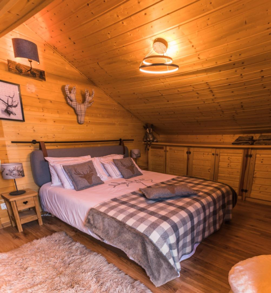 The ground floor is composed of an entrance hall with a ski room, the living room and open kitchen with a surface area of 50 m2 opening onto a terrace of 60 m2 will welcome you in its cocooning atmosphere thanks to its wood stove, its comfortable sofas and its built-in TV. On the ground floor, a sauna and two double bedrooms with TV, one with private shower room, the second with a whirlpool bath. Separate toilet.