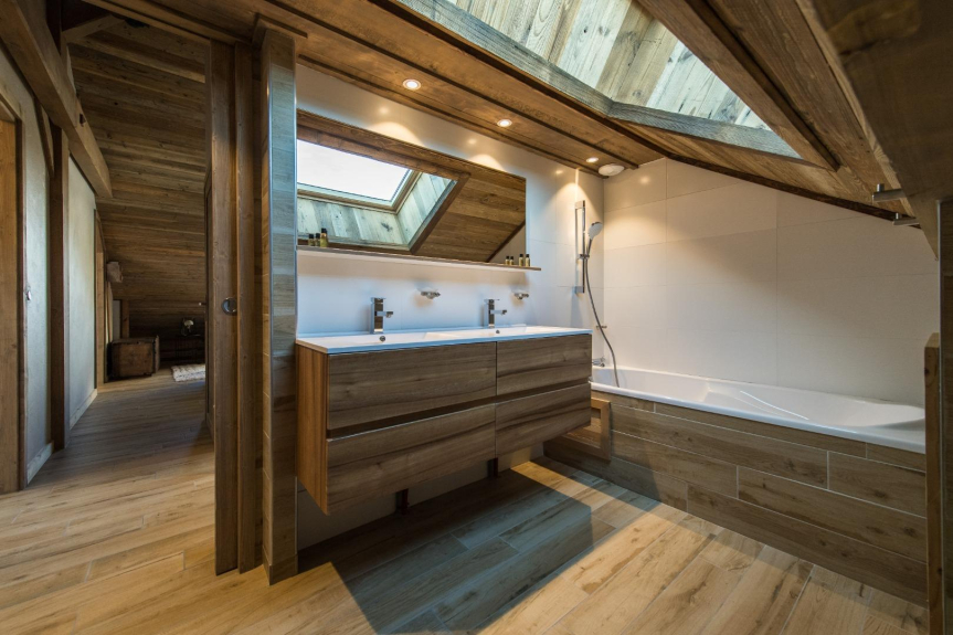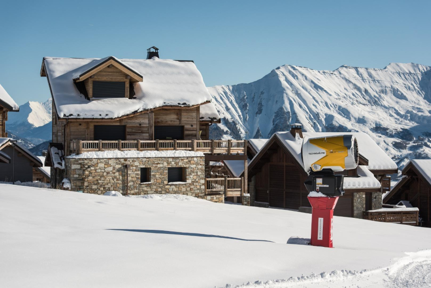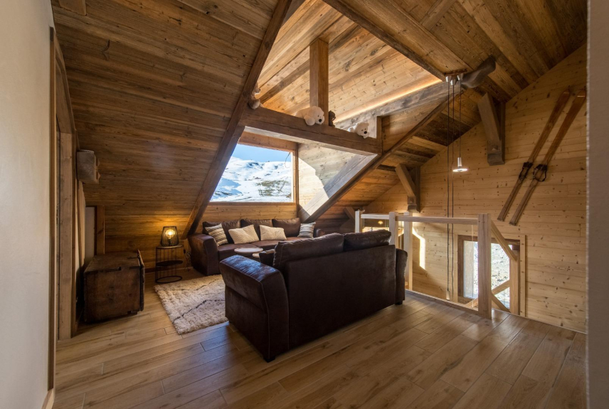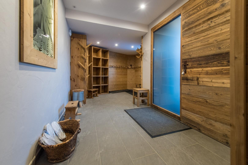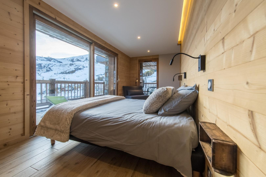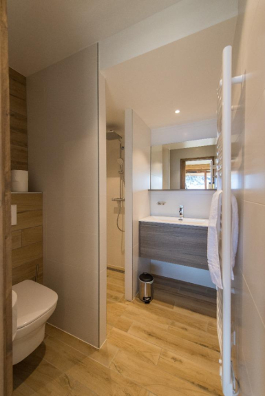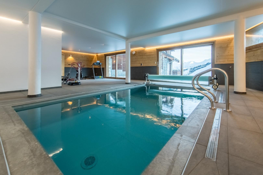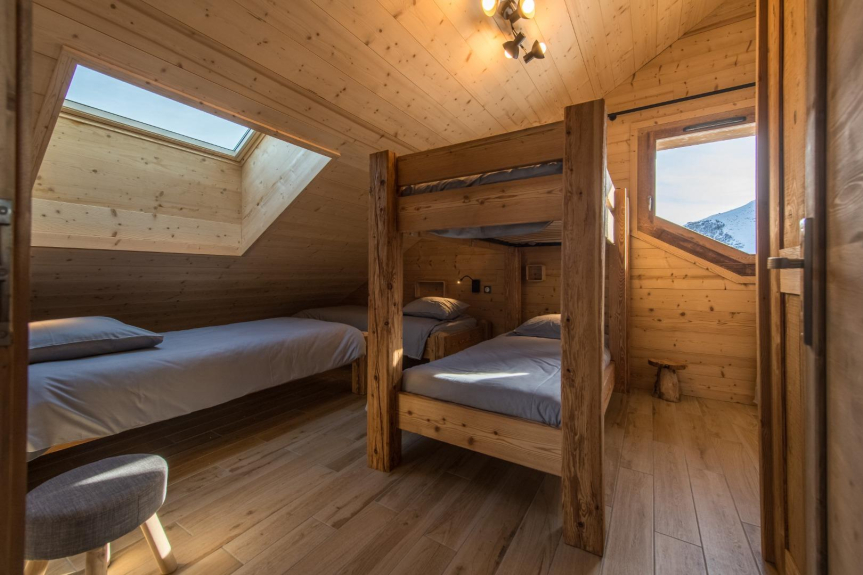 Le Temps des Copains is a 5 star chalet (ministerial classification) of 335m2 located along the slopes (ski in/ski out), built on the heights of the resort of La Toussuire in 2018. Level N-1 : indoor swimming pool with counter-current swimming, sauna, shower and large beach; home cinema; laundry room; wc. Ground floor: ski room with boot dryer, 4 parental suites (beds 160x200) each with Italian shower and private wc, 3 with built-in cupboards and 1 with dressing room. Level N+1 : living room of 90m2 : lounge, library, dining room (16 guests), fireplace and kitchen with storeroom; large terrace with barbecue; wc. Level N+2 : 1 bedroom with 3 beds (90x200), 2 of which are bunk beds, built-in cupboard; 1 bedroom with 4 beds (90x200), 2 of which are bunk beds, built-in cupboard; a shower room with Italian shower and a bathroom (bathtub) with double washbasin; 1 wc