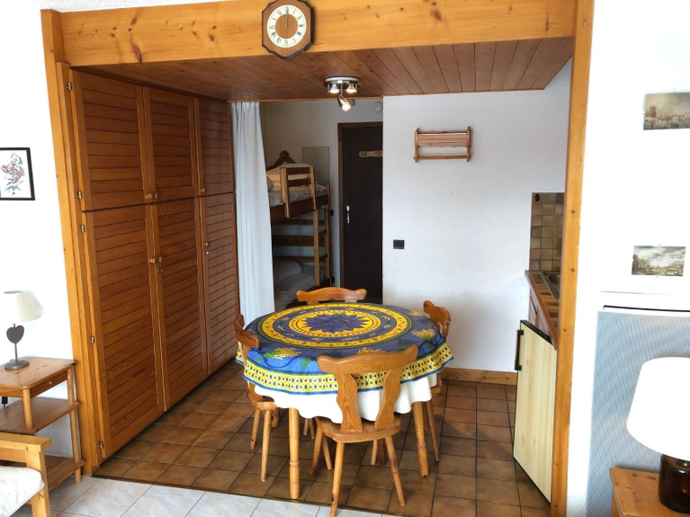 Studio-cabin ideally located in the centre of the resort. Large terrace of 16m² facing south with a breathtaking view on the Mont Bisanne and its slopes. Immediate access to the ski slopes of the Espace Diamant. Outside ski locker.
