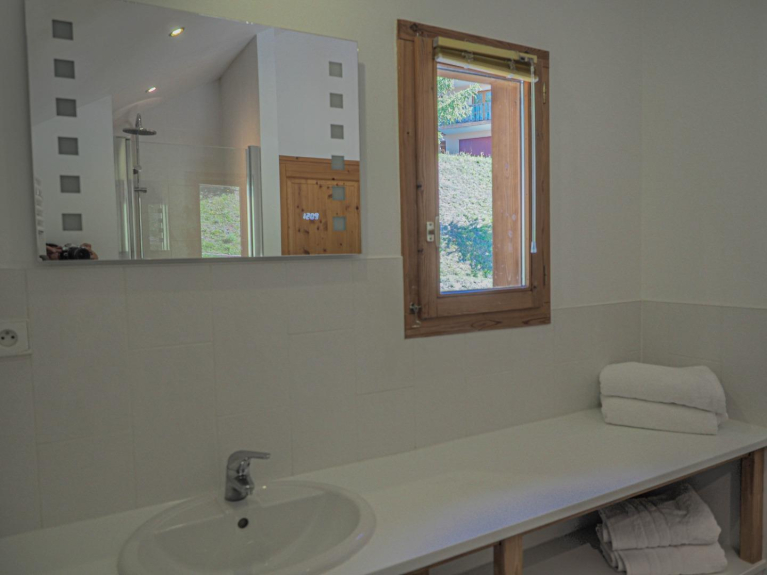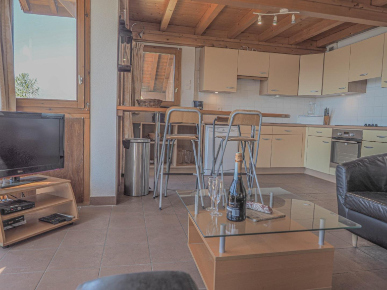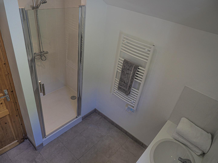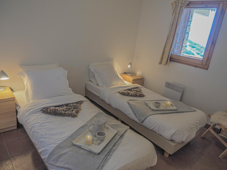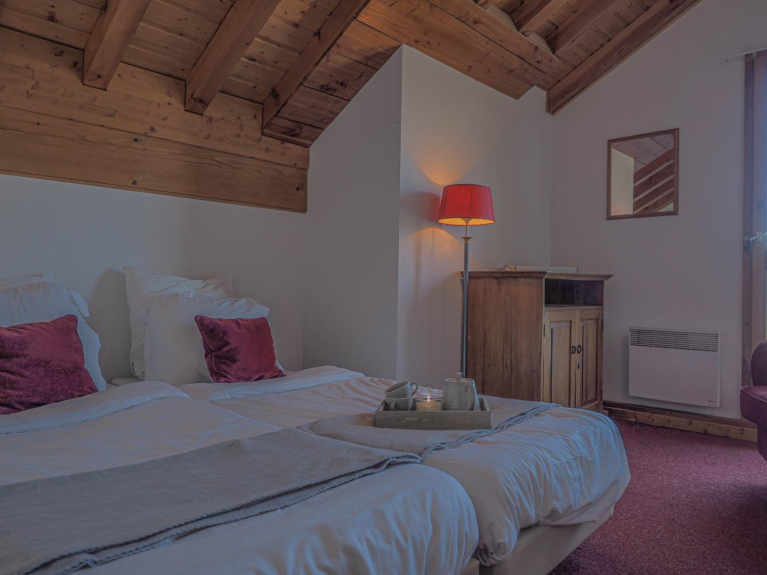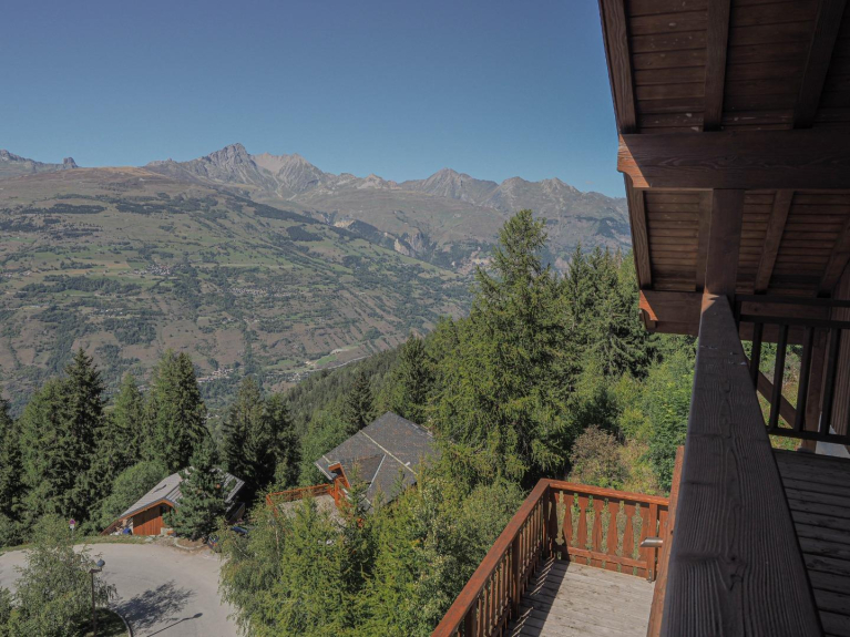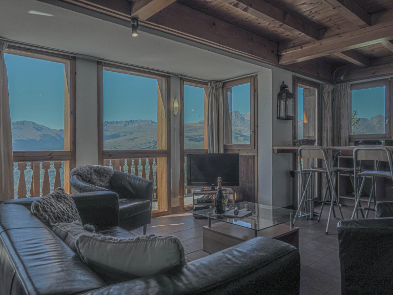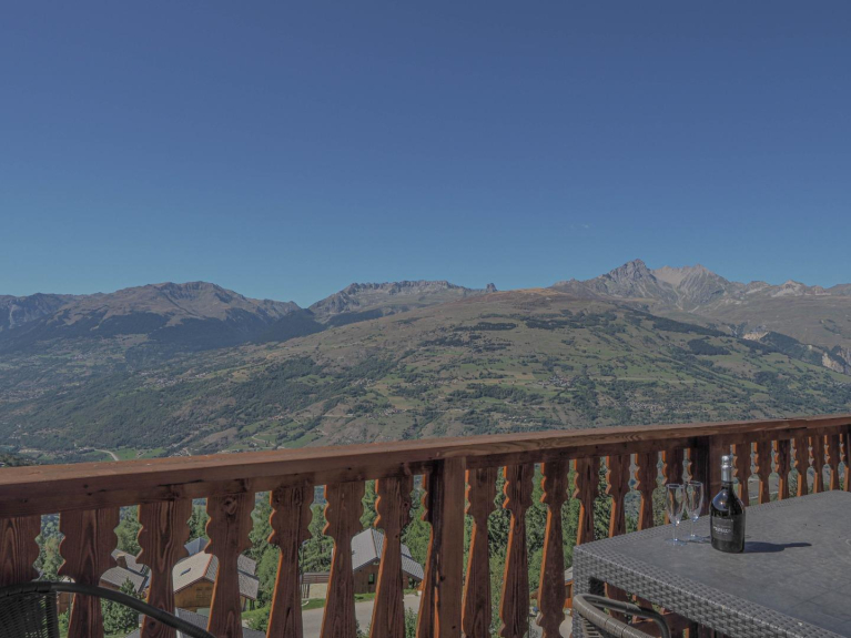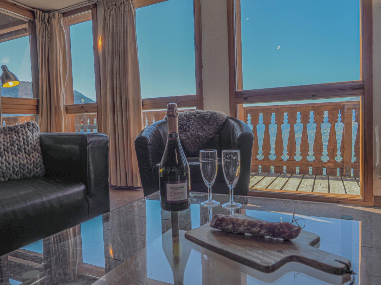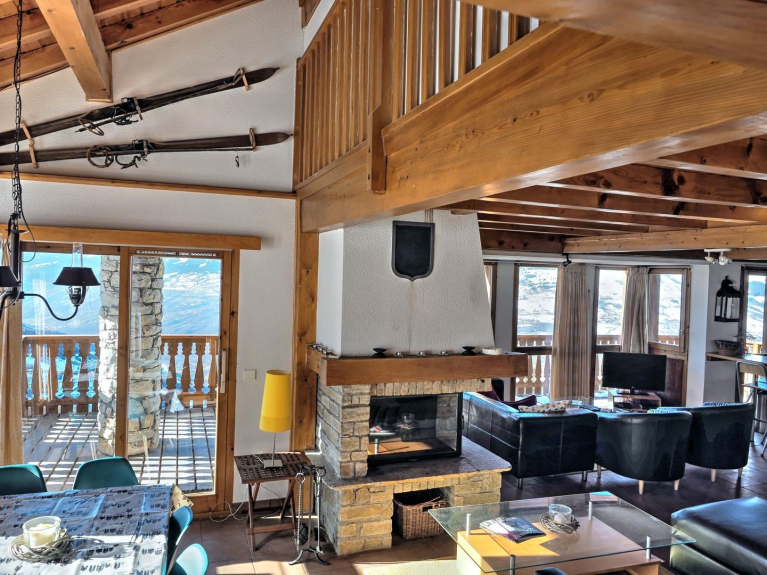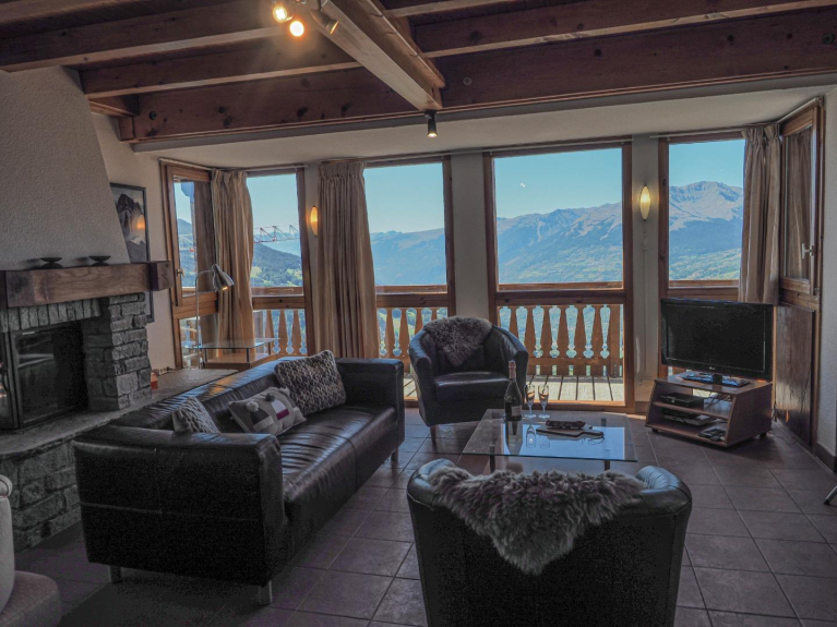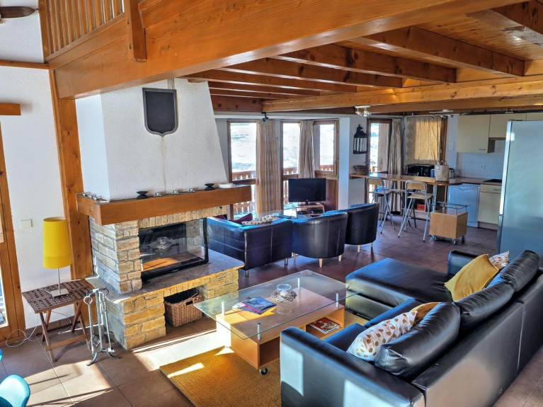 A cozy yet spacious chalet ideal for families or groups of friends. The living room has 2 seating areas so plenty of space to relax in after a day on the slopes in front of the log fire, flat screen TV or just taking in the view from the floor to ceiling windows which wrap around the front of the building with views down the Tarentaise Valley.