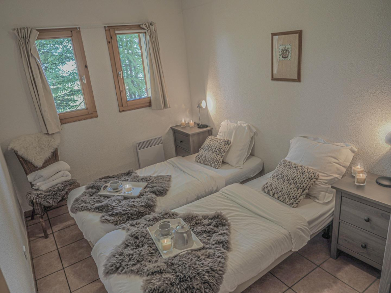 The chalet comprises of 1 double room, 3 twin rooms, 1 mezzanine area with 2 single beds and a room in the eaves with 2 singles beds but limited ceiling height. Upstairs there is a shower room and downstairs 2 further bathrooms, 1 with bath and shower over and one shower room with sink.